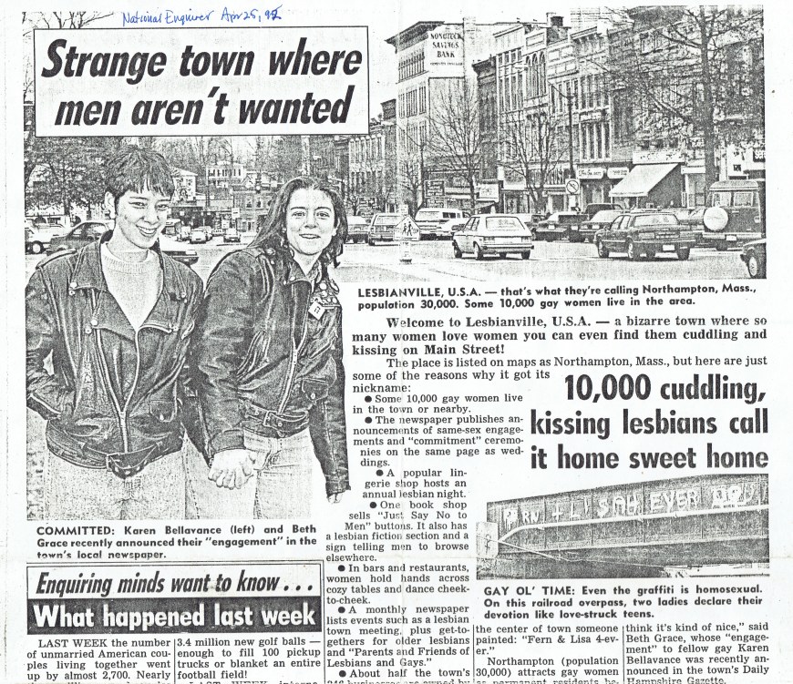 On a historical note, for the day of the Pride parade the Hampshire Gazette published an extremely well researched feature article by Greta Jochem , “The Legend of ‘Lesbianville’: Looking back at a city nickname and claim to fame.” If you don’t get frustrated by the paywall, it includes not only the story of that coined term but links to the 1990s national news coverage that led to and then piled on the straight media titillation.