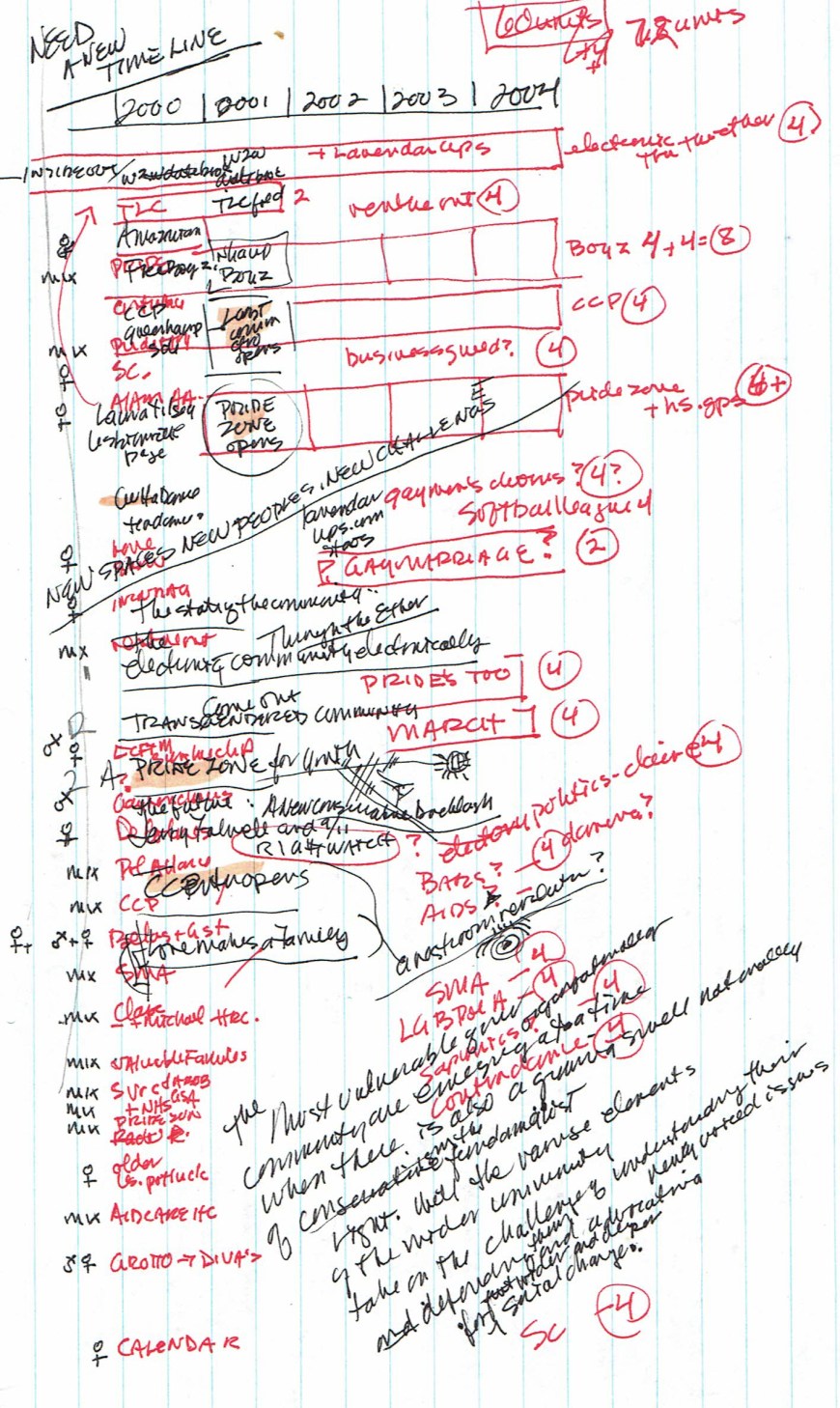 This is one of my working timelines of LGBTQ+ organized activity centered in the Northampton area. I HOPE TO SHARE ALL THE STORIES REPRESENTED ON THIS TIMELINE SOMETIME IN THE FUTURE. It functions as a rough outline for organizing my work and has gone through multiple drafts. I last roughed out these four decades of timeline in 2004 from my research notes. Each timeline is also organized thematically. These can be laid side by side for continued content over the decades. They also fit within a larger Valley context (and timeline.) These timelines are not complete nor definitive. For example, I might have found mention once of a group meeting in some alternative Valley newspaper calendar, so noted them in that year but have no other evidence of their meeting before or after, or even if anyone showed up. I have a fantasy that someone(s) with Excel spreadsheet talent will transcribe it into a document, which, pie-in-the-sky, could become the basis for interactive content.