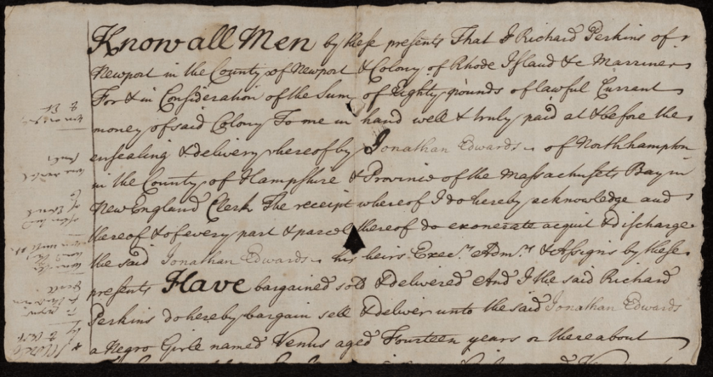 KNOW ALL MEN by these presents That I Richard Perkins of Newport in the County of Newport & Colony of Rhode Island &c Marriner For & in Consideration of the Sum of Eighty pounds of lawful Current money of said Colony To me in hand well & truly paid at & before the ensealing & delivery hereof by Jonathan Edwards of Northampton in the County of Hampshire & Province of the Massachusetts Bay in New England Clerk The receipt whereof I do hereby acknowledge and thereof & of every part & parcel thereof do exonerate aquit & discharge the said Jonathan Edwards his heirs Execrs Admrs & Assigns by these presents HAVE bargained sold & delivered And I the said Richard Perkins do hereby bargain sell & deliver unto the said Jonathan Edwards a Negro Girle named Venus aged Fourteen years or thereabout TO HAVE & TO HOLD the said Negro girl named Venus unto the said Jonathan Edwards his heirs Execrs & Assigns and to his & their own proper Use & behoof for Ever AND I the said Richard Perkins do hereby for my Self my heirs Execrs & Admrs covenant promise & agree to & with the said Jonathan Edwards his heirs Execrs Admrs & Assigns by these presents That I the said Richard Perkins at the ensealing & delivery hereof have in my own Name good Right, full Power & lawfull Authority to bargain sell & deliver the said Negro Girl named Venus unto the said Jonathan Edwards in manner & form aforesaid And shall & will warrant & defend the said Negro Girle named Venus unto the said Jonathan Edwards his heirs Execrs Admrs & Assigns against the lawfull Challenge & Demand of all manner of Persons whatsoever Claiming or to claim by from or under me or otherwise howsoever IN WITNESS whereof I the said Richard Perkins have hereunto set my hand & Seal the Seventh day of June in the Fourth Year of the Reign of our Soveraign Lord George the Second by the grace of God of Great Britain France & Ireland King Defender of the Faith &c