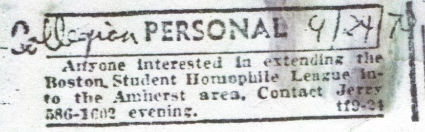 Arpin goes on to mention a sudden and rapid increase in gays coming to him for Saturday night confession at St. Mary’s. This culminated in a group of them from the “Gay Student Union” ( probably UMass SHL/GLF) knocking on the rectory door to speak with him. They told Arpin, with thanks, that he was the first priest in the area who hadn’t thrown them out as soon as they identified themselves.